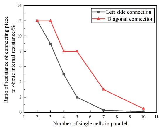 For different numbers of single cells connected in parallel to the battery pack, to ensure that the maximum deviation of the SOC between single cells is 5% as the goal, it is necessary to conduct a simulation to find the maximum value of the resistance of the connecting piece of resistance and ohmic resistance ratio. Cell-1 is for the left side of the connecting structure of the parallel connection, Cell-2 is for the center of the connecting structure of the parallel connection, and the results of the simulation are shown in Figure 14. It can be seen that as the number of parallel connections of the number of single units increases, the resistance of the connecting piece of the resistance value of the requirements of the gradual increase in value, along with the number of single units connected to the parallel connection. After the number of monomers on one side of the connection structure exceeds seven, it is necessary that the resistance value of the connecting piece is not higher than 1% of the internal resistance of the battery, and the ratio of the center-connected structure decreases more slowly. The battery ratio of the center-connected structure shows a stepwise decrease, because when designing for an even number of monomers connected in parallel, the center-connected structure takes any one of the two monomers in the middle, and then the maximum difference in the resistance value of the connecting piece is similar to that of an odd number of monomers, and the simulation results are therefore similar. Because of the unilateral connection structure, every time the number of monomers increases, it will bring an increase in the maximum difference of the resistance of the connecting piece of the monomer battery, so the ratio continues to decline. Therefore, it is suggested that, when using the single-side connection structure, the number of parallel monomers should not be more than seven as far as possible, and the influence of the connection structure on the consistency of the battery pack can be reduced by adjusting the resistance value of the connecting tabs; when using the central connection structure, an odd number of monomers can be considered, which can obtain a larger capacity without destroying the consistency.