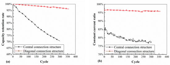 (a) Capacity retention rate; (b) constant current ratio. Curves of battery performance with cycle times under two connection structures.
