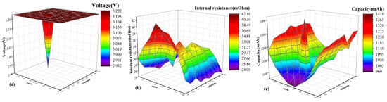 Figure 17b shows that there is a single cell with abnormal voltage in the middle of the battery pack, and after taking out the single cell for testing, it is found that its voltage and internal resistance are lower than that of the surrounding cells, there may be an internal micro short circuit, and it is difficult to determine the time of the appearance of the micro short circuit, but after the battery is formed into a battery pack, the abnormal single cell will accelerate the aging of the surrounding single cells, which will have a bad effect on the consistency of the battery pack. Figure 17c shows that, on the one hand, it illustrates the influence of the abnormal monomer on the surrounding monomers, and on the other hand, the capacity of the battery near the center line is lower, and the higher capacity around it indicates that the aging degree of the center line part is higher, which corroborates the previous simulation analysis of the center connection structure.