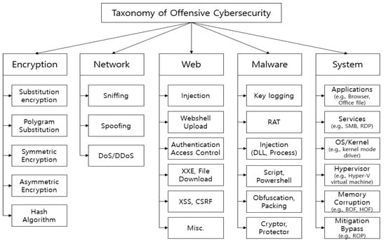 The second scenario is when the attackers use an offensive cybersecurity (OS); in detail, the encryption is a method to encrypt information, and also use substitution, symmetric, asymmetric, and hash algorithms. According to Kyoungoon Kim [52], this selection has an experimental model based on OS according to threat actor capacity against cyberphysical systems (CPSs) and persons including encryption, networks, web, malware, and systems (Figure 4).