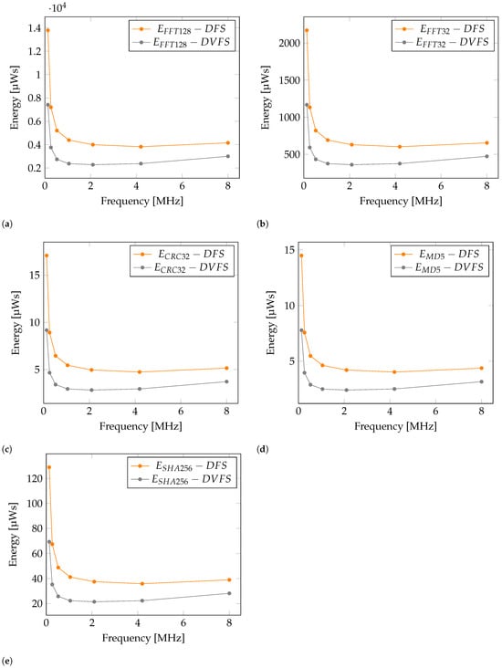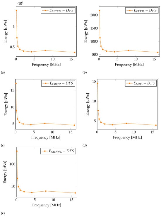 Energy consumption graph with applied DFS for operation: (a) , (b) , (c) , (d) , (e) .