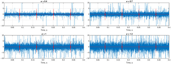 Cyclic impulses (marked red) hidden in -stable noise, , scale parameters: 0.4, 0.7, 1, and 1.3, respectively.
