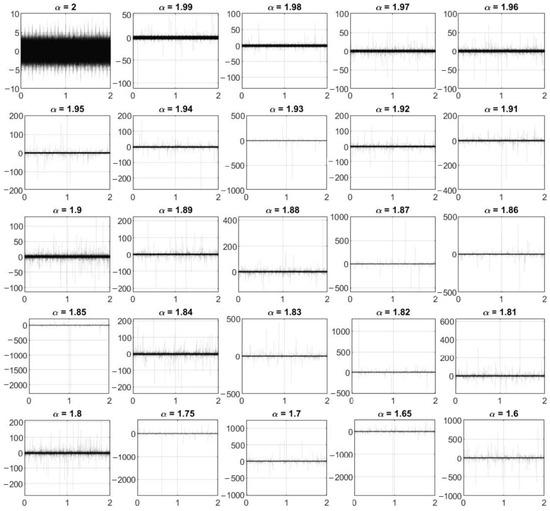 - —stable noise was generated as described in Section 2.2. The vibration signal in real life is symmetric and centered around zero; hence, and are equal to zero, respectively. Parameter was defined at 25 levels. It decreases from 2 to 1.8 with a resolution of 0.1, and from 1.75 to 1.6 with a resolution of 0.5. Additionally, four values of parameter were considered, namely: 0.3, 0.7, 1, and 1.3.