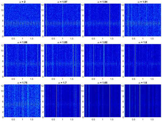 Exemplary spectrograms for and the varying parameter are presented in Figure 4. Note that, for the same pair of and , the spectrograms are different, since we are dealing with a random process. For better visibility, the authors selected 12 values of . The impulses corresponding to the fault are represented by the cyclic vertical lines (they are visible with period T = s and a center frequency of kHz). As one can see, when parameter decreases, the vertical lines are covered by the increasing non-Gaussian noise.
