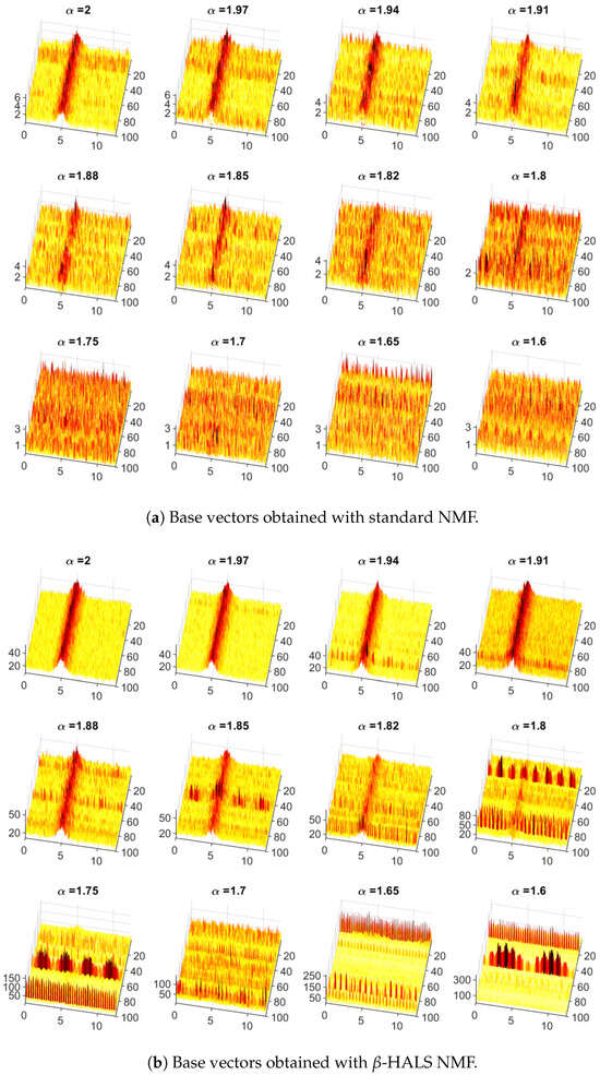 This study presents an approach that demonstrates the effectiveness of a tool such as NMF for vibration and acoustic data analysis. The authors take into consideration two NMF algorithms: a multiplicative one for minimizing the Euclidean objective (Standard NMF) [42] and a generalized version of the hierarchical alternating least square algorithm (-HALS) for minimizing the Beta-divergence [43,44], and study the influence of two parameters of the -stable noise on NMF effectiveness. By changing the parameters of the probability distribution (stability index and scale parameter ), the authors modify the level of non-Gaussianity and the noise intensity. To evaluate both NMF models, 25 levels of the parameter and four levels of were taken into account. The main goal of this study is to demonstrate how the effectiveness of the NMF algorithms changes with these two parameters, and to determine the level at which the algorithms no longer return reliable results with a satisfactory probability. This information can be used as a warning to users in practical applications.