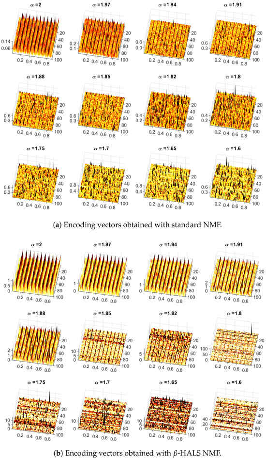 Encoding vectors obtained with the standard (top panel) and -HALS NMF (bottom panel) for 100 trials and selected values of . The ENVSI measure was used to select the class corresponding to the fault.