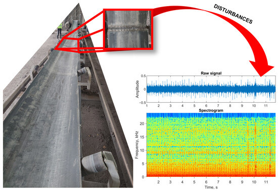 The measurements were obtained using a typical smartphone. In fact, the video was recorded and the sound extracted from it. The experiment consisted of measuring the sound of 10 s duration for each idler, with the sampling frequency kHz. The real-life belt conveyor is presented in Figure 7 (left). The belt located on it is joined by a metal clip (marked with a red frame). When it passes through the idler, there is interference in the sound signal (as illustrated on the right side).