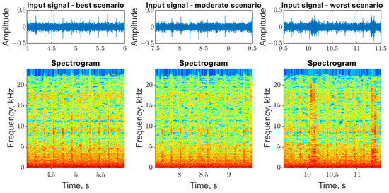 Selected input signals (top panels) and corresponding spectrograms (bottom panels).