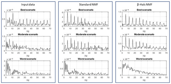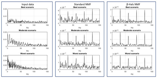 Envelope spectra obtained by the input data (left panels), standard NMF (middle panels), and -HALS NMF (right panels) for each scenario. The spectra corresponding to the signals in Figure 8.