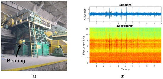 Real-life copper ore crusher (panel a) and input signal with corresponding spectrogram (panel b).