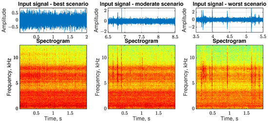 - The first part between 4–6 s is labeled as the best scenario. All the cyclic impulses are clearly visible in the time series and the corresponding spectrogram; thus, high-quality results are expected for both NMF methods. The estimated value of is equal to 1.975.