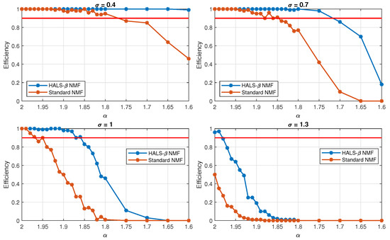 Efficiency of both tested NMF algorithms (i.e., HALS- NMF and Standard NMF) for 4 levels of and 25 levels of . The efficiency of 90% is represented by the red horizontal line.