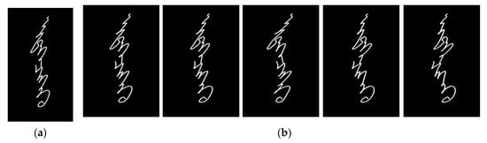 Data augmentation (DA) is an important means to improve the training effect of neural network models by augmenting the training set. DA algorithms for character recognition research have appeared for Chinese, English, and other languages. With the application of machine learning and neural networks in many fields, DA technology has also been greatly developed. In 1998, Lecun et al. [] developed data augmentation for the MNIST database by using various operations, such as scaling, rotation, and stretching, to effectively improve the recognition accuracy of the character recognition model. Experimental results have shown that the elastic deformation data augmentation method [] proposed for sequence character recognition can help improve the efficiency of character recognition models. In 2017, Zhong et al. [] proposed a random erasing data augmentation (REDA) algorithm for the target detection task. By erasing random areas in the target image, random erasing data augmentation algorithms can improve the robustness against occlusion and realize data augmentation. In 2021, Han et al. [] used generative adversarial networks (GANs) to enhance the data of ancient characters, reconstruct the region-specific information of the character, and improve the ability of the model to extract image features. It can be seen that in the field of character recognition, it is theoretically feasible to augment the data of character images for training.