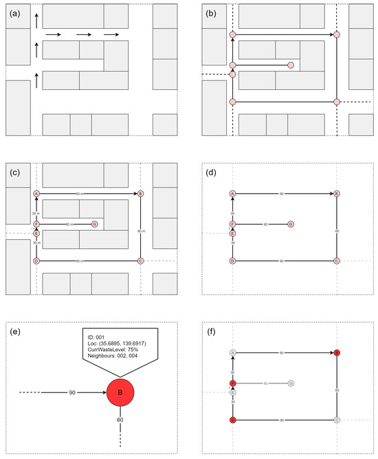 As a mixed graph has both directed and undirected edges, it is suitable for representing a road map, as schematized in Table 3. In the context of a graph, G, representing a city road map, one can envisage the trajectory of a council worker collecting waste from dumpsters by traversing a path within G. As a result, each street is conceptualized as a node, while intersections serve as the connecting edges. This graph-based representation captures the spatial relationships and connectivity between different segments of the city, providing a structured framework for analyzing and optimizing transportation networks. Graphs allow urban planners and researchers to model various attributes of streets, such as traffic flow, accessibility, and connectivity, facilitating data-driven decision-making processes. Graph-based representations of city streets offer a versatile platform for the application of algorithms and analytics. Graph algorithms, such as Dijkstra’s algorithm or the A* search algorithm, can be employed to find optimal routes, identify critical transportation corridors, and optimize traffic flow. Moreover, the integration of additional data layers, such as land-use information or demographic data, enables a more holistic understanding of the urban landscape. This graph-centric approach not only aids in the planning of transportation infrastructure but also contributes to the development of smart city initiatives, supporting sustainable and efficient urban development.