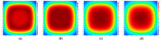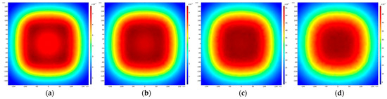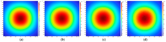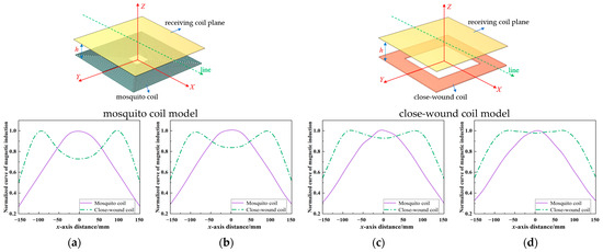 The magnetic induction intensity distribution characteristics of both mosquito coils and close-wound coils were investigated by obtaining the magnetic field distribution on the receiving coil plane at varying heights (h) for these coil types via simulation, as shown in Figure 4 and Figure 5.