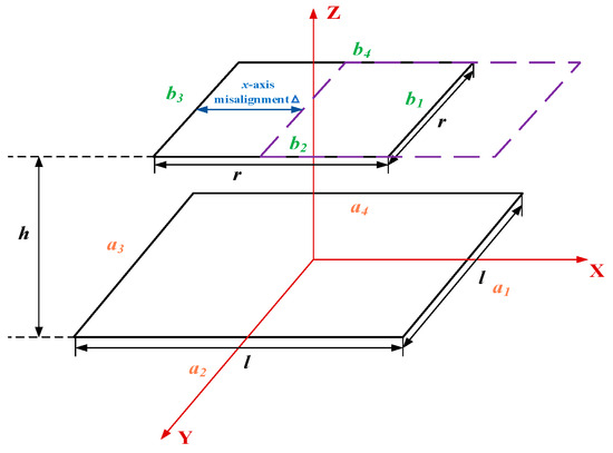 After defining the coordinates of any point on sides a1 and b1 as (l/2, y1, 0) and (r/2, y2, h), respectively, and the coordinates of any point on sides a2 and b2 as (x1, l/2, 0) and (x2, r/2, h), respectively, the Ma1b1 and Ma2b2 values following a horizontal misalignment Δ undergone by the receiving coil can be determined in accordance with the Neumann formula as follows [20]: