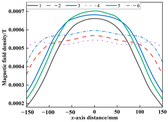 Using the center of the combined coil as the origin, a straight line passing through the points (−150 mm, 0 mm, h mm) and (150 mm, 0 mm, h mm) is drawn. Figure 8 illustrates the distribution curve of the magnetic flux density along this line under different arrangement methods.