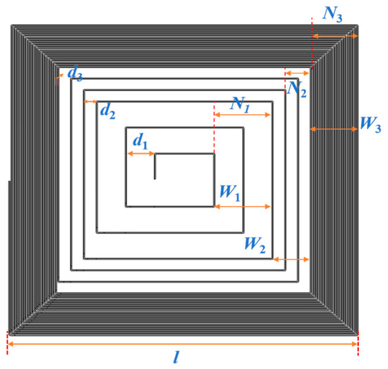 As shown in Figure 9, the first and second layers are mosquito coils, and the third layer is a close-wound coil. The inter-turn distances of the three layers of coils are denoted by d1, d2, and d3, respectively. The widths of the three layers of coils are denoted by W1, W2, and W3, respectively. The number of turns of the three layers of coils are denoted by N1, N2, and N3, respectively. The total width of the coil is denoted by S.