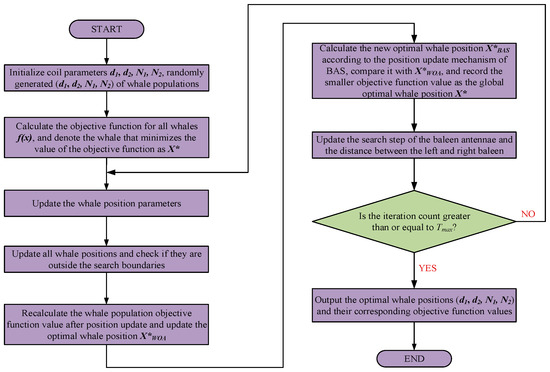 - Initialize the DMC coil parameters (d1, d2, N1, and N2) and randomly generate a whale population (d1, d2, N1, and N2).