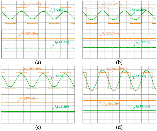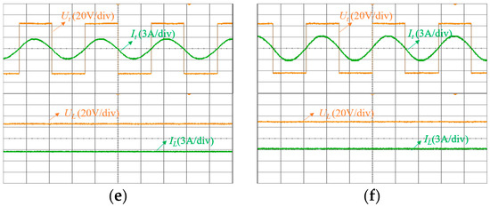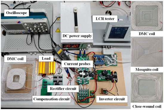 An experimental platform based on the IPT system shown in Figure 2a was built, as depicted in Figure 14. The coupled coils and the receiving coil have an outer diameter of 142 mm × 142 mm, while the DMC coil, the mosquito coil, and the close-wound coil have an outer diameter of 300 mm × 300 mm. A was used as the controller in this experiment to collect the signals and generate the PWM waves. The transmitting and receiving coils of the magnetic coupling mechanism were wound with 0.1 mm × 200 strands of Litz wire. The coil mutual inductance was measured using a Chroma 11050-5M high-frequency LCR tester. The voltage at both ends of the load was measured using a Tektronix MSO 2024B oscilloscope, and the load current was measured using an RP1001C current probe.