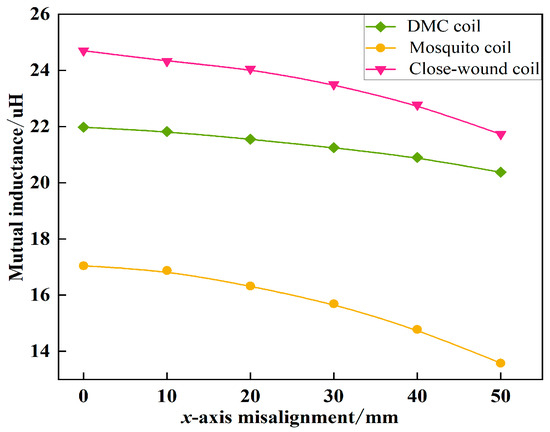 Using the position where the receiving coil and the transmitting coil are coaxially aligned and the transmission distance is 50 mm as the reference base, we measured the mutual inductance of the DMC, mosquito-coil, and close-wound coil transmitters during a 50mm horizontal misalignment of the receiving coil. The results are shown in Figure 15.
