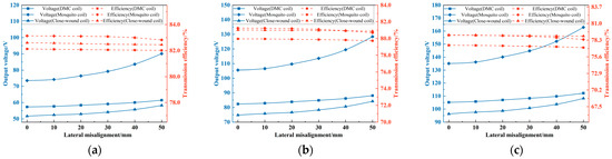 As shown in Figure 16, when RL = 10 Ω, the output voltage of the IPT system with the DMC coil was 29.89 V and the efficiency was 83.3% when the coils were aligned; the output voltage was 32.09 V and the efficiency was 83.13% when the coils were displaced by 50 mm; the output voltage fluctuation rate of the system during the displacement process was 7.4%. The output voltage of the mosquito coil was 38.45 V, and the efficiency was 84.45% when the coils were aligned; the output voltage was 47.47 V, and the efficiency was 84.1% when the coils were displaced by 50 mm; the output voltage fluctuation rate of the system during the displacement process was 23.46%. The output voltage of the close-wound coil was 26.77 V, and the efficiency was 83.28% when the coils were aligned; the output voltage was 30.18 V, and the efficiency was 82.86% when the coils were displaced by 50 mm; the output voltage fluctuation rate of the system during the displacement process was 12.7%. It can be seen that the output voltage fluctuation rates of the three coils are significantly different, while the efficiencies are similar. Therefore, under the condition of comparable efficiency, the output voltage fluctuation rate is the main criterion for comparison. Compared with the mosquito coil and the close-wound coil, the output voltage fluctuation rate of the DMC coil is significantly lower, and the system’s robustness to displacement is greatly improved.