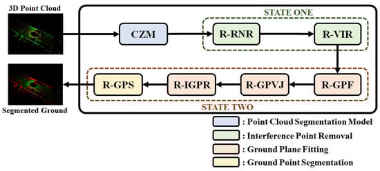 This algorithm, based on the concentric zone model (CZM), designs several key modules to achieve ground extraction from LiDAR point cloud. CZM divides a point cloud into multiple sector ring regions with regular intervals of radial and azimuthal angle. Meanwhile, the density of sector ring regions in each zone can be set through parameters. The key modules include region-wise reflected noise removal (R-RNR), region-wise vertical interference removal (R-VIR), region-wise ground plane fitting (R-GPF), region-wise ground plane validity judgment (R-GPVJ), region-wise invalid ground plane repair (R-IGPR), and region-wise ground point segmentation (R-GPS). Based on the functionality of each module, they can be divided into two stages: interference point removal stage and ground plane fitting stage. The overall framework of the algorithm is illustrated in Figure 1.