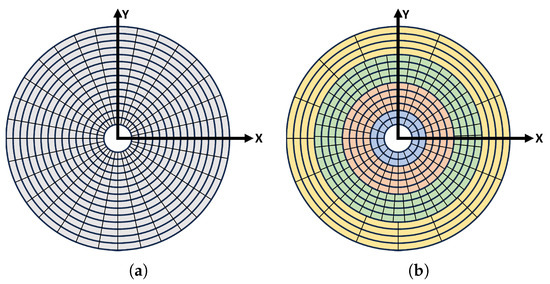Because the ground surface is typically not a perfectly flat plane, it is necessary to divide the point cloud set P into multiple small regions and assume that the ground in each region is a flat surface. Based on the above idea, the uniform polar grid model [39,40] was proposed as shown in Figure 2a. The uniform polar grid model divides the set P into multiple rings based on the radial distance from the center, and each ring is further divided into smaller sector ring regions based on the azimuth angle. However, there are some obvious problems with the model. When the sector ring region is located too close to the center, its area becomes small, resulting in fewer points being contained within it. In addition, due to the sparsity problem of the point cloud, the point cloud becomes sparser as the distance from the center increases. This means that sector ring regions located far from the center will also contain fewer points. Both scenarios can lead to poor ground plane fitting within the sector ring regions.
