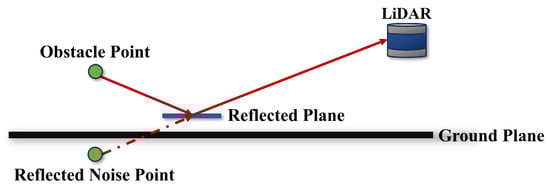 According to the research conducted by Zhao X et al. [41], as shown in Figure 3, when a laser beam illuminates surfaces made of materials such as glass or metal, specular reflection often occurs. If the specular reflection contacts an obstacle, it will reflect to the laser receiver along the opposite path. Since the sensor is unaware of this reflection, the acquired points will be located incorrectly. These points are referred to as reflected noise points. As the incident angle increases, the reflection intensity of these noise points decreases. Based on this principle, Patchwork++ [29] introduces reflected noise removal (RNR) module. This module searches for all points in the point cloud that are below the specified height one by one and identifies the points with reflection intensity below the threshold as reflected noise points.
