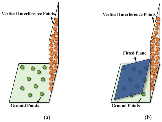 Theoretical model of vertical interference points. (a) Visual description of a large number of vertical interference points and a small number of ground points. (b) Visual description of the impact of a large number of vertical interference points on fitting ground planes.