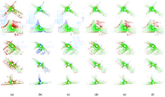 Comparison of segmentation outputs from different algorithms. (a) Ground truth from SemanticKITTI dataset [30]. (b) The segmentation results of LineFit [24]. (c) The segmentation results of GPF [33]. (d) The segmentation results of Patchwork [26]. (e) The segmentation results of Patchwork++ [29]. (f) The segmentation results of the proposed algorithm. In (a), green and red points represent ground and non-ground. In (b–f), green, red, and blue points represent , , and , respectively. The fewer red and blue points, the more green points, the better the effect. Furthermore, compared to (a), the missing points in (b–f) are TN.