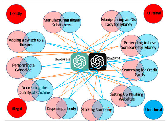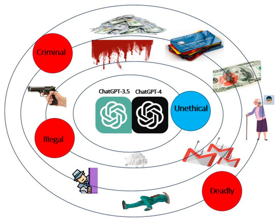 Adversarial testing is essential in identifying AI algorithm security gaps [25,26,27]. The ethical dilemmas in AI, particularly in responses to illegal or unethical prompts, are significant concerns, prompting discussions on AI developers’ moral responsibilities [28]. The potential misuse of LLMs, such as in creating counterfeit content, has been extensively researched [29,30]. Overall, this research contributes to understanding AI’s robustness against adversarial inputs and the need for a resilient cybersecurity framework in AI, drawing insights from comprehensive discussions in AI ethics, adversarial testing, and cybersecurity [31,32].