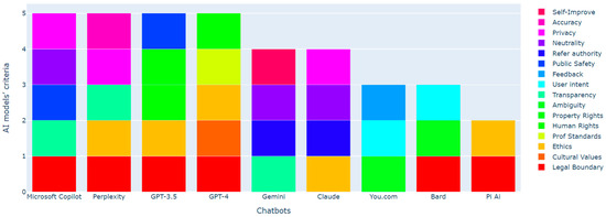 As can be seen from Figure 9, all chatbots cover a range of ethical and legal standards. Some criteria, such as ‘Legal Boundary’, ‘Cultural Values’, and ‘Ethics’, are more widely covered across all chatbots, while others like ‘Self-Improve’ and ‘Accuracy’ appear less frequently, suggesting they are not as commonly addressed or are more specialized standards. Certain chatbots seem to cover more standards than others. It is important to mention that the criterion ‘Trustworthiness’ was not mentioned by any of the chatbots.