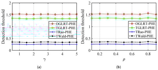 Figure 1 illustrates the detection thresholds of proposed detectors in various cases of power mismatch and , respectively. We can find that the detection thresholds of proposed detectors are less affected by the changes in and , which confirms that the four detectors have CFAR property against and in turn.
