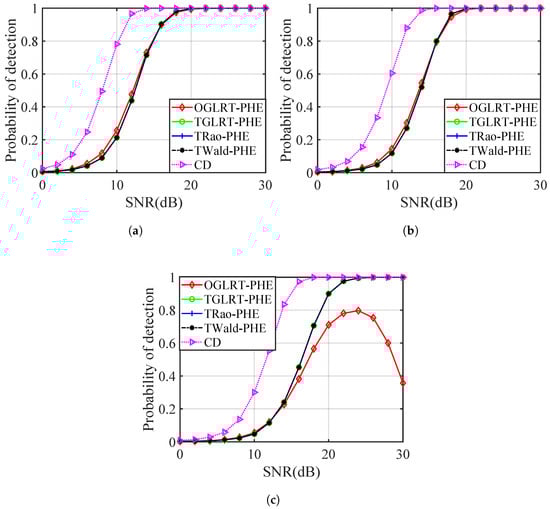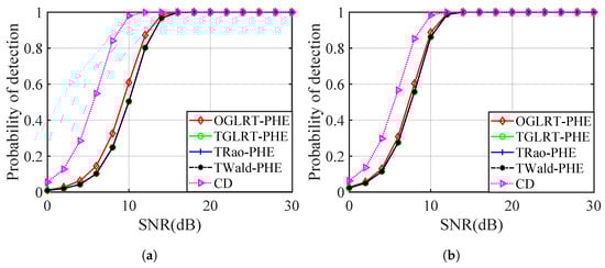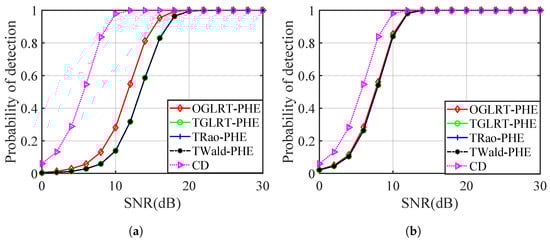 Figure 3 shows the detection performance of the proposed detectors with different sample covariance snapshots. It is observed that as we take more sample covariance snapshots L, the detectors’ performance improves. This is consistent with the results obtained by increasing the number of snapshots K, as shown in Figure 2. The improvement is because increasing L and K provides more training data, which enhances the estimation precision of the covariance matrix . However, there is a notable difference between Figure 2b and Figure 3b. With the same amount of training data (the product of K and L is equal), increasing the number of snapshots K leads to significant improvement in detection performance. Moreover, Figure 3a illustrates that the proposed OGLRT-PHE detector outperforms other proposed detectors with less training data.
