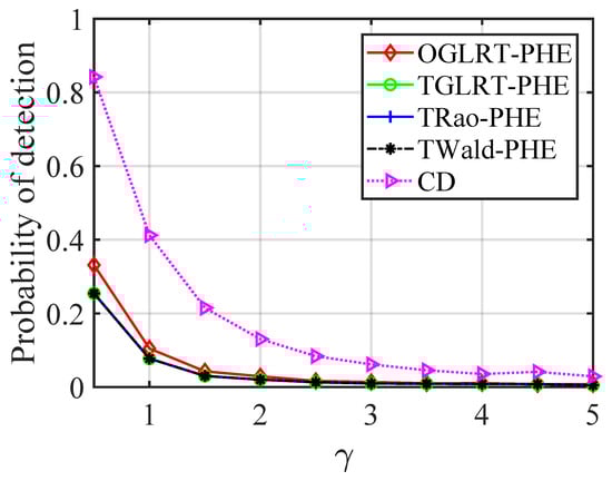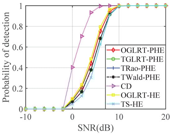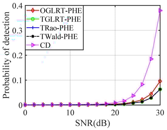 Figure 2 displays the detection performance of proposed detectors with different snapshots. In the legend, CD denotes the detector in (38) with a known covariance matrix . Please note that this detector is impractical since it requires knowledge of the covariance matrix in advance. However, this ideal detector provides a useful performance constraint for any suboptimal method. Hence, it can be used to measure the performance of the proposed detectors. From Figure 2, it is evident that the OGLRT-PHE detector achieves a superior detection performance compared to the other three proposed detectors. This is because the OGLRT-PHE detector uses both the training and test data to estimate the covariance matrix , which results in a more accurate estimation. The remaining three proposed detectors perform similarly as their detection statistics expressions are equivalent. Additionally, the larger the number of snapshots K, the better the performance of the proposed detectors, and the smaller the performance gaps between the proposed detectors and CD. Therefore, it can be predicted that when the number of snapshots K is large enough, the performance of all proposed detectors will be almost the same. This is because a larger number of snapshots leads to an increase in training data, which in turn provides a more reliable estimate of the covariance matrix .