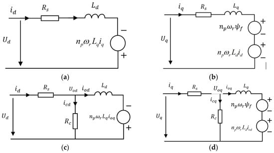 The mathematical model of a PMSM considering iron losses is depicted in Figure 1c,d, and its equivalent equations are presented as follows: