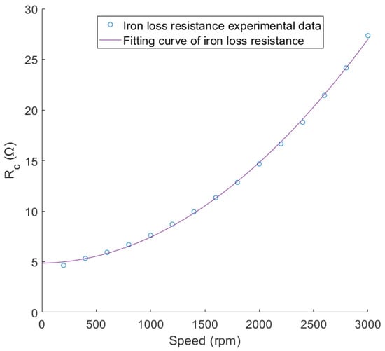 There are generally two methods to obtain the iron loss resistance: one involves using finite element analysis software, and the other entails fitting experimental data to derive the relationship between iron loss resistance and speed [,]. In this study, the latter method is employed to acquire the value of iron loss resistance (as shown in Figure 3). The specific parameters of the iron loss resistance are represented by Equation (4):