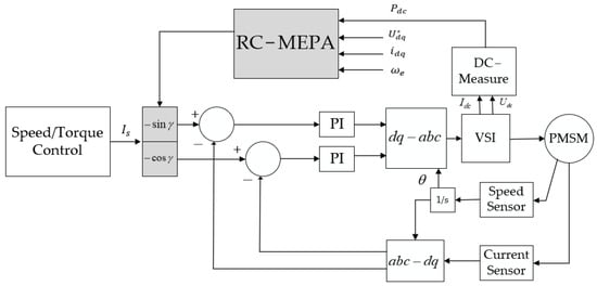 Based on the aforementioned efficiency function considering iron losses, an improved discrete gradient descent algorithm can be employed to implement MEPA control for the PMSM. Specifically, during steady-state operation, the optimal current angle is sought to maximize the motor efficiency. Figure 4 illustrates the schematic of the MEPA control proposed in this paper.