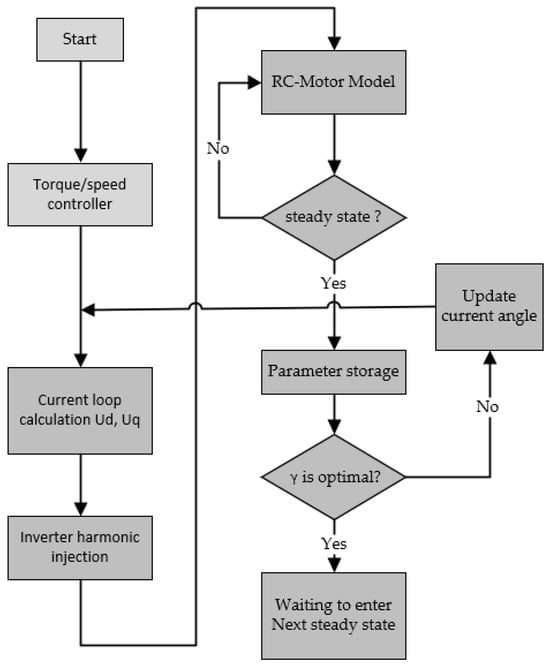 Figure 5 depicts the control flowchart proposed in this paper. Upon the initiation of the drive system into operational status, in the initial phase, the amplitude of the current vector is computed based on the control mode. Subsequently, the current loop is calculated with respect to the initial current angle, yielding . To account for the impact of inverter harmonics on the actual motor drive system, the inverter distortion voltage is superimposed onto calculated in the current loop. This results in the voltage injected with inverter harmonics. This voltage is then input to the driven motor through the Space Vector Pulse Width Modulation (SVPWM) waveform generator. While the motor is operational, a steady-state recognizer is employed to determine whether the motor has reached a steady state. If the motor has not reached a steady state, it awaits stabilization. Once a steady state is achieved, the parameters needed for calculating efficiency, apart from the current angle , are stored for iterative optimization. Using the gradient descent algorithm within the search space, the optimal solution is sought and employed to update the current angle, ensuring that the motor operates at the highest efficiency under these conditions.