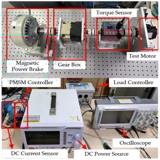 In order to assess the effectiveness of the proposed motor control strategy in comparison to traditional control methods, an experimental motor testing platform was established, as depicted in Figure 6. The motor under test is connected to a torque sensor via a coupling, allowing measurement of the motor’s output torque, speed, and power. The torque sensor is further linked to a gear mechanism, connecting to a magnetic powder brake. The magnetic powder brake facilitates the adjustment of the load, enabling the examination of motor output power under various loading conditions. The motor’s input power is determined by measuring the DC side current in conjunction with a 24 V power supply.