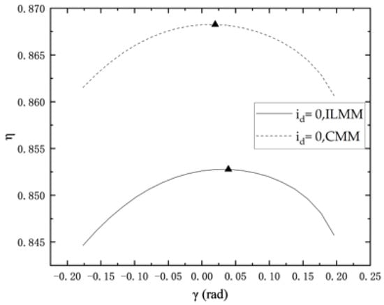 Figure 7 illustrates the efficiency-angle curves of two motor models under identical operating conditions, Where the triangle symbol represents the position of the optimal value. The models include the ILMM and the CMM. Triangular symbols represent the corresponding optimal current angles. It is evident from the graph that under the same conditions, the optimal current angles measured by the ILMM and the CMM differ by approximately 0.02 radians, and this discrepancy may vary with different operating conditions. Due to the consideration of iron losses in the ILMM, its calculated efficiency is relatively lower compared to that of the CMM.