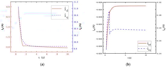 d-q axis current and iron loss current curve: (a) d-q axis current l; (b) d-q axis iron loss current.