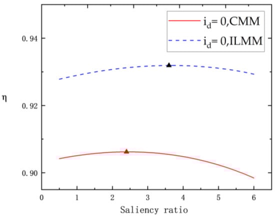 To analyze the impact of the saliency ratio on motor efficiency, simulations were conducted for both motor models under the operating condition of 1500 rpm and 0.6 Nm. As depicted in Figure 10, when simulating with the conventional motor model, the highest efficiency is achieved at a saliency ratio of 3.6, reaching 93.18%. Conversely, when simulating with the ILMM, the peak efficiency is observed at a saliency ratio of 2.4, reaching 90.62%. Therefore, the sensitivity of motor efficiency to the convex pole ratio varies when using different motor models for simulation.