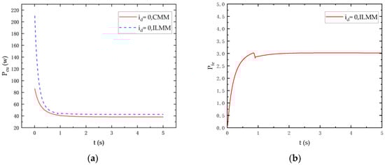 Figure 11 presents a comparative analysis of losses between the two motor models. As observed from the graph, simulating with the ILMM results in the motor copper loss stabilizing around 44 W, while the iron loss stabilizes at approximately 3.02 W, constituting approximately 6% of the total losses. In contrast, simulating with the conventional motor model yields a copper loss stabilizing at around 38.3 W. Since the conventional motor model does not account for iron loss due to the resistance of the iron loss, the motor efficiency calculated by the conventional motor model is slightly higher than that obtained from the ILMM.