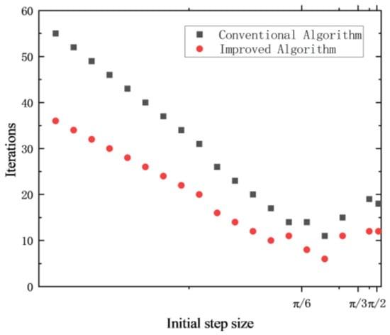 In order to compare the impact of the initial step size on the iteration count of the two algorithms, the traditional system efficiency calculation model was used. By varying the initial step size, iteration count charts for both optimization algorithms were obtained, as depicted in Figure 12. It can be observed that with an increase in the initial step size, the iteration count gradually decreases. However, beyond a value of , the iteration count slightly increases. This is attributed to the fact that an excessively large search step results in oscillations around the optimal value. Therefore, within a given range of step sizes, there exists an optimal initial step size. The graph reveals that both the traditional algorithm and the modified algorithm converge optimally at an initial value around .