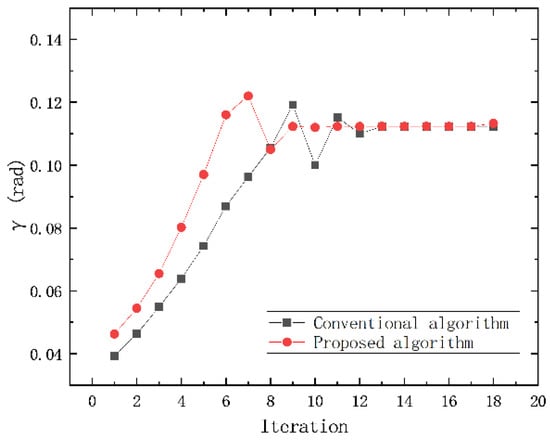 Figure 13 presents the variation in the electrical angle with iteration count for the two optimization algorithms under the proposed system efficiency calculation model in this paper. It is evident from the graph that the optimal electrical angles for both algorithms stabilize around 0.11 radians, yet there is a noticeable difference in iteration counts. The traditional algorithm takes approximately 13 iterations to reach a stable value, while the algorithm proposed in this paper tends to stabilize after only nine iterations, demonstrating a higher convergence speed. It is noteworthy that the efficiency calculation model proposed in this paper is derived based on the ILMM, resulting in a relatively increased computational load compared to traditional efficiency models. As a result, the iteration count for traditional optimization algorithms increased from 11 to 13, while for the algorithm proposed in this paper, it increased from 6 to 9 iterations. Hence, in MEPA control, the additional computational load arising from the complex model proposed in this paper can be compensated for by the optimization algorithm on a comprehensive level.