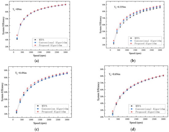 Different load condition efficiency-speed experimental curves for three control strategies: (a) = 0 Nm; (b) = 0.35 Nm; (c) = 0.4 Nm (d) = 0.6 Nm.