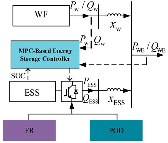 Figure 3 illustrates the control framework for the energy storage, utilizing digital twin technology, which encompasses the wind farm and the energy storage system. The MPC-based controller is used for the fluctuation suppression, the frequency regulation unit for the frequency support, and the POD unit for the oscillation suppression.