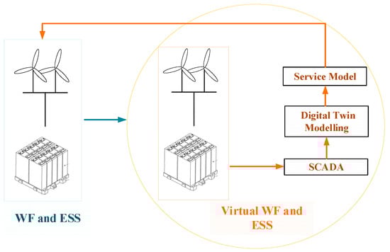 The integrated wind storage system is composed of wind turbines and storage, each equipped with SCADA units, featuring interfaces for data reception in both the wind farm (WF) and the energy storage system (ESS). This configuration ensures a seamless flow of operational data between the physical components and their digital counterparts. Digital twin technology, known for its speed and precision, is employed in this study to align data captured by real-time monitoring devices with a digital simulation model. This alignment allows for the comparison of simulated operational data against actual equipment performance, serving as a crucial tool for operational oversight.